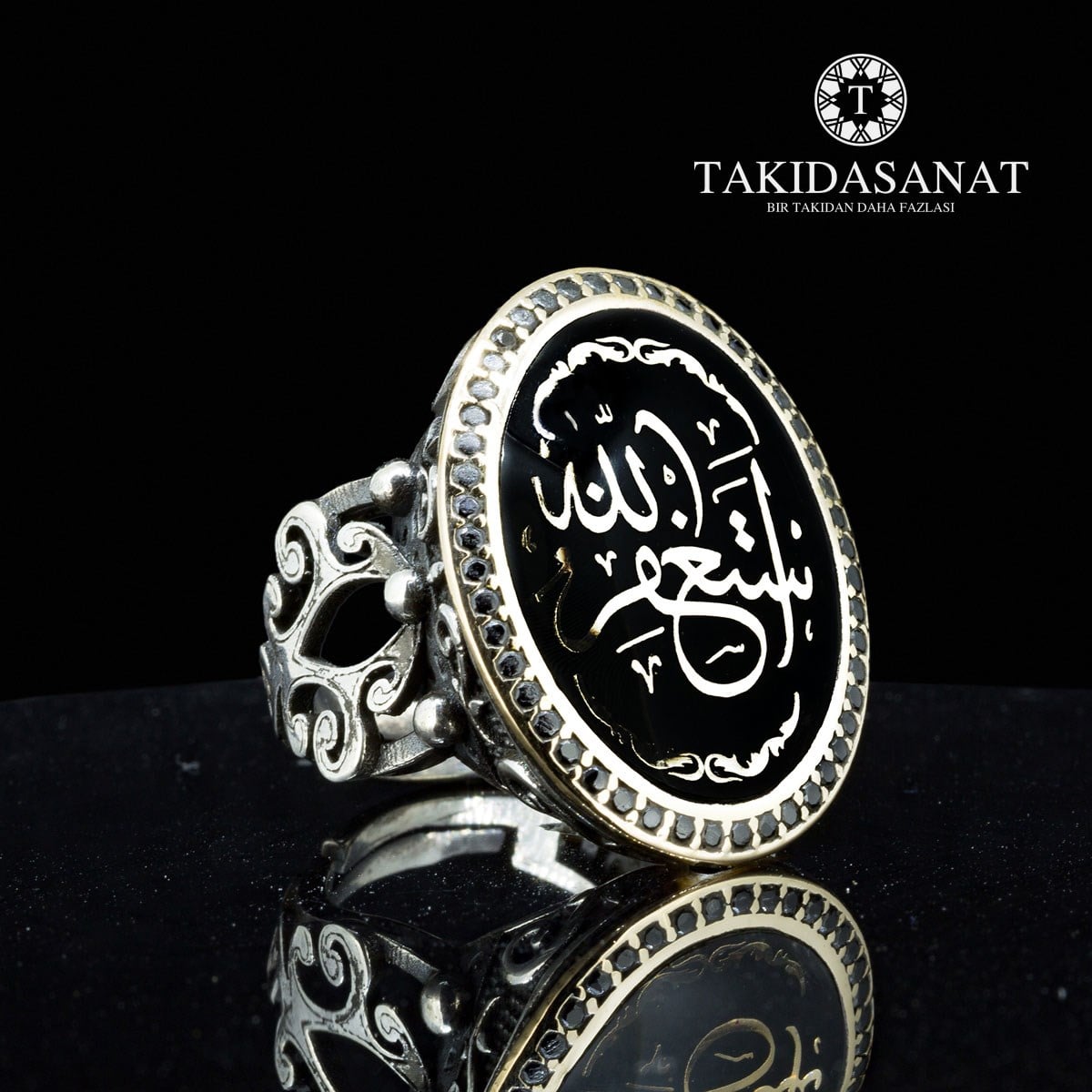 Hat sanatıyla "ESTAĞFİRULLAH" (Allahım beni affet) yazılı siyah taşlı gümüş yüzük