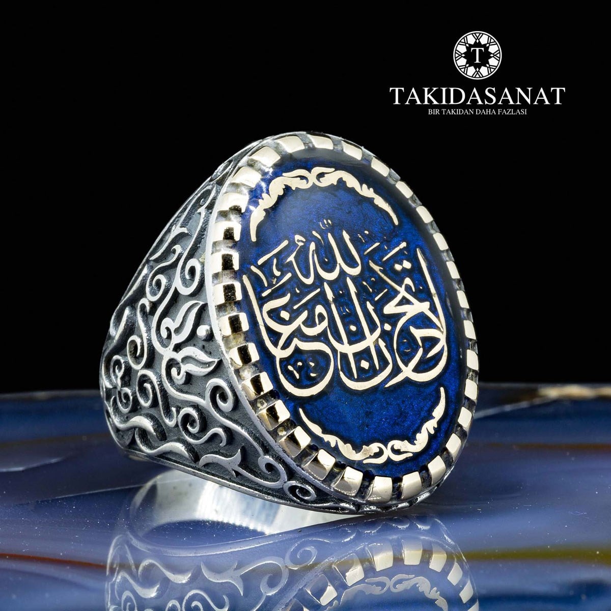 HAT SANATIYLA "LA TAHZEN İNNALLAHE MEANA" (ÜZÜLME ALLAH MUTLAKA BİZİMLE BERABERDİR" YAZILI OVAL FORMDA GÜMÜŞ BİR YÜZÜK